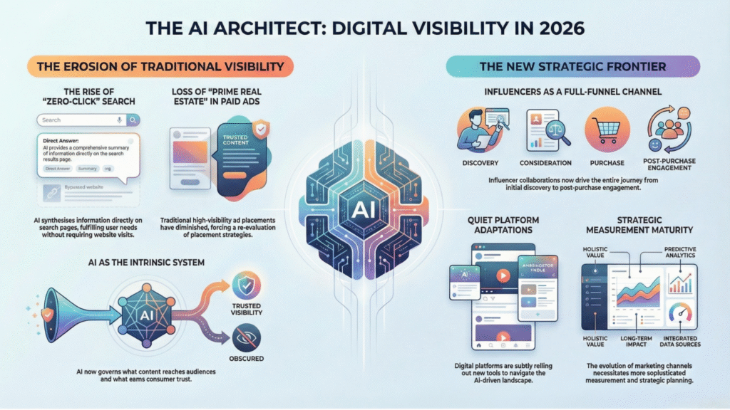 The digital marketing landscape, as observed 2026, unequivocally established Artificial Intelligence (AI) as the principal architect of online visibility, engagement, and trust. Historically regarded as an additive feature or a set of specialized tools within marketing operations, AI has now transitioned to become the intrinsic system that governs what digital content reaches its audience, what content is bypassed by users, and critically, what ultimately earns consumer trust. This profound shift indicates a complete re-architecting of how digital interactions are mediated and perceived.