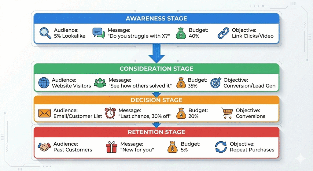 | Brand awareness | Reach / Awareness | Maximum qualified reach | Don’t expect direct ROAS fast |